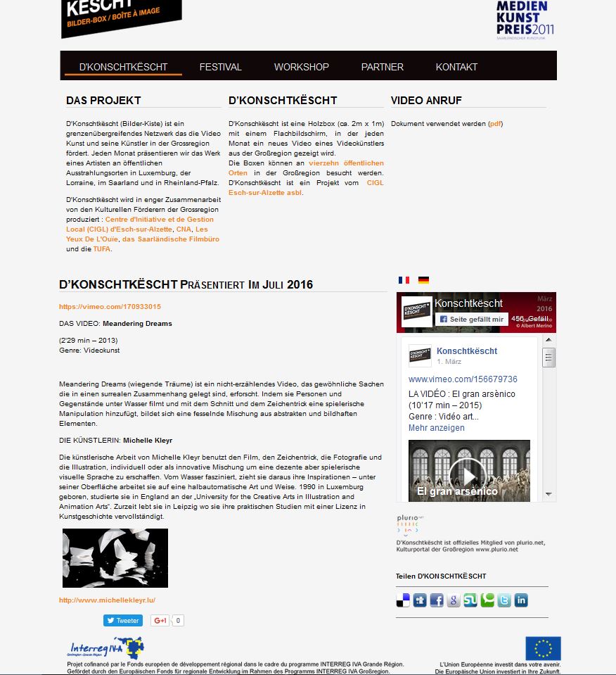 Hi there, heard of Konschtkëscht before? You can run into one of 14 "artboxes" if you visit one of the participating culture places in and around Luxembourg. This cross-border project, established to promote video-art and the video artists in the greater region, presents one video every month online and in the artboxes in various art and culture locations. Well as you might have guessed already this July they selected to present my video Meandering Dreams, so you are welcome to go and have a look!